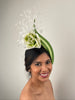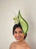 This stunning Aditi headpiece is light and easy to wear and eye-caching from all view points. A gorgeous lime green headpiece with a large ivory and green rose and ivory feathers on the underside.