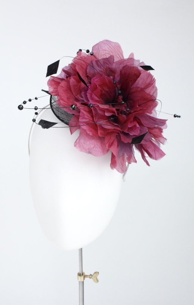 This fabulous cocktail hat is created from a collection of hand painted silk poppies in deep pinks and purples. The flowers are set on a 5 inch black base of hand rolled leaves and finished with beaded wire springing from the flower centres.