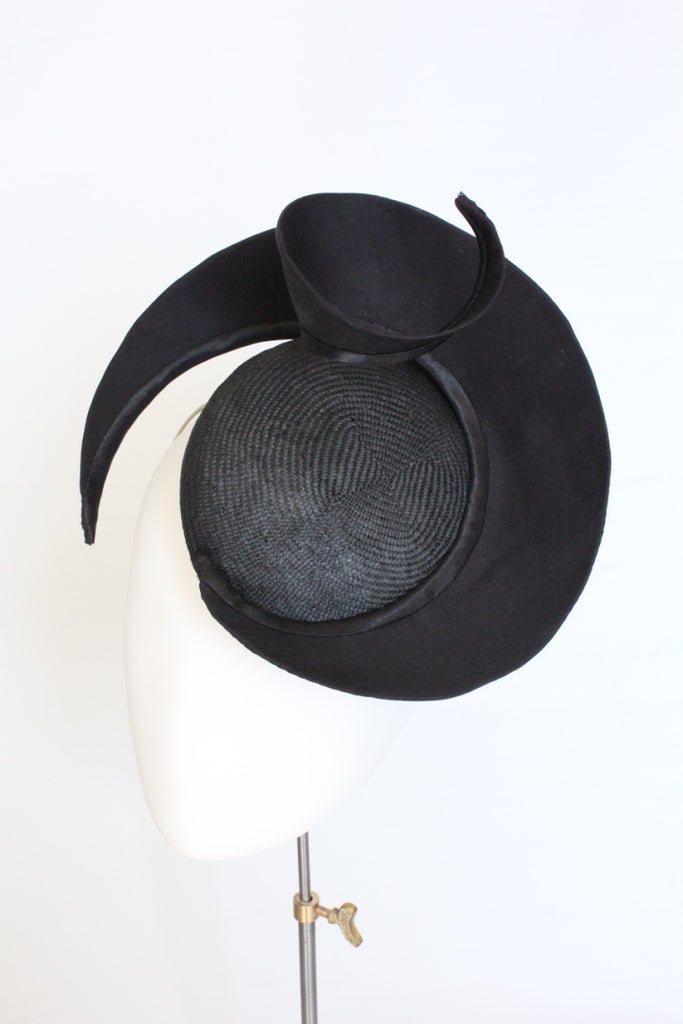Strike a pose in this unique statement piece! The strong contours of this hat are accentuated by a sleek silk satin lining resulting in a truly dynamic, contemporary piece that is sure to turn heads. Available to hire in Black