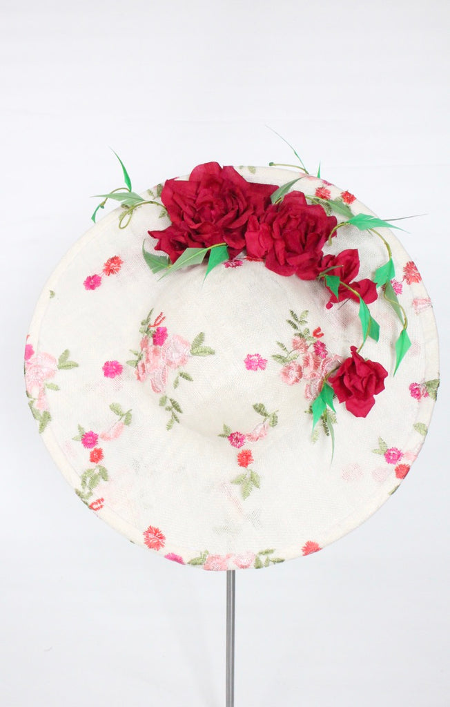 Make a summer statement with our stunning Hebe hat! Covered in embroidered tulle with hand made silk roses rambling across both the top and undersides of this elegant disc shaped hat- it's a whimsical winner!