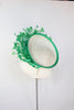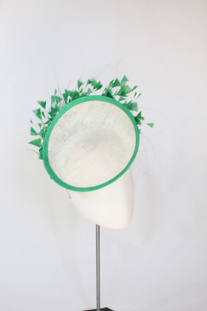 A beautiful emerald green and ivory disc shape with a beautiful spray of emerald feathers on the underside. A variation on our "Juno" hat which is also available to hire