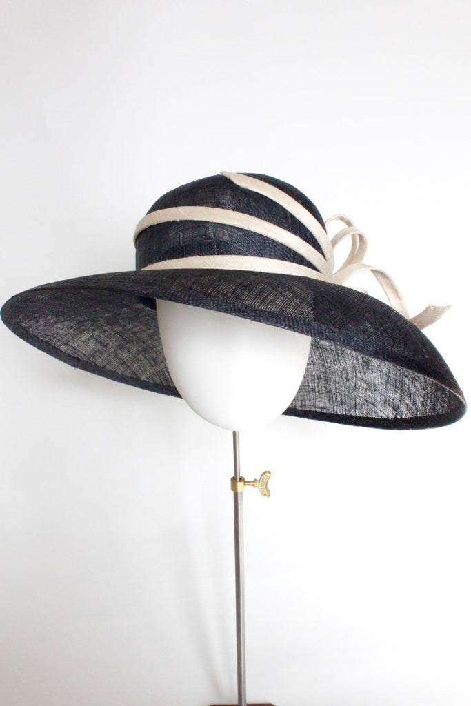 Unleash your inner Audrey Hepburn with this graceful wide brimmed hat. With its sweeping brim and beautiful silk ribbon detailing you can’t help but feel the epitome of elegance wearing it. Available to hire in navy blue with ivory detailing as pictured