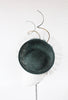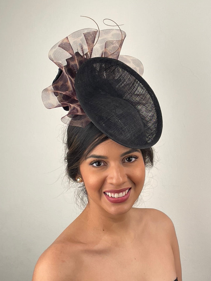 This elegant black disk is complimented by soft waves of animal print crinoline with a large black soft silk flower and twisted gold quills to the back.
