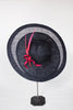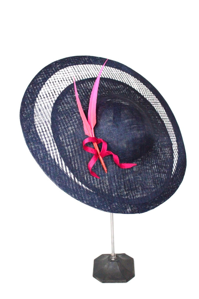 A large navy sinamy saucer hat using Shibumi's "Vivid" silk for the ribbon and 2 feathers dyed with a pink and coral ombre.