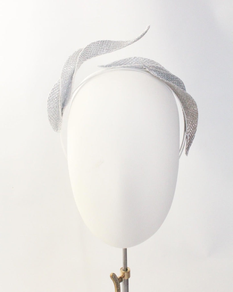 Hand shaped sparkly silver leaves twist their way elegantly over the wearer's head for an organic, modern halo headband. This piece can be created in different colours and materials, please contact us to enquire further.